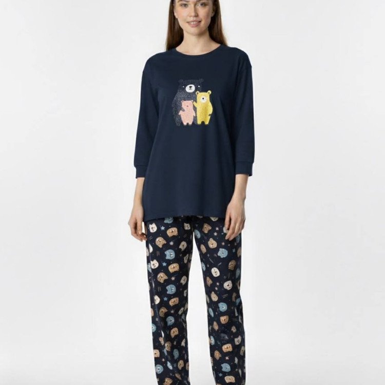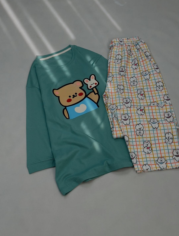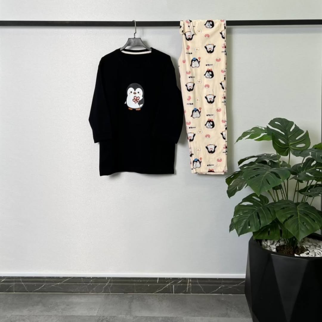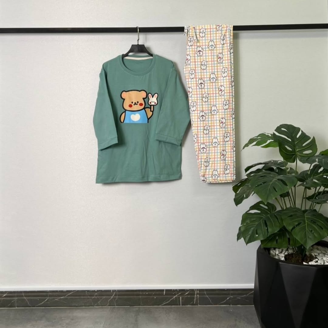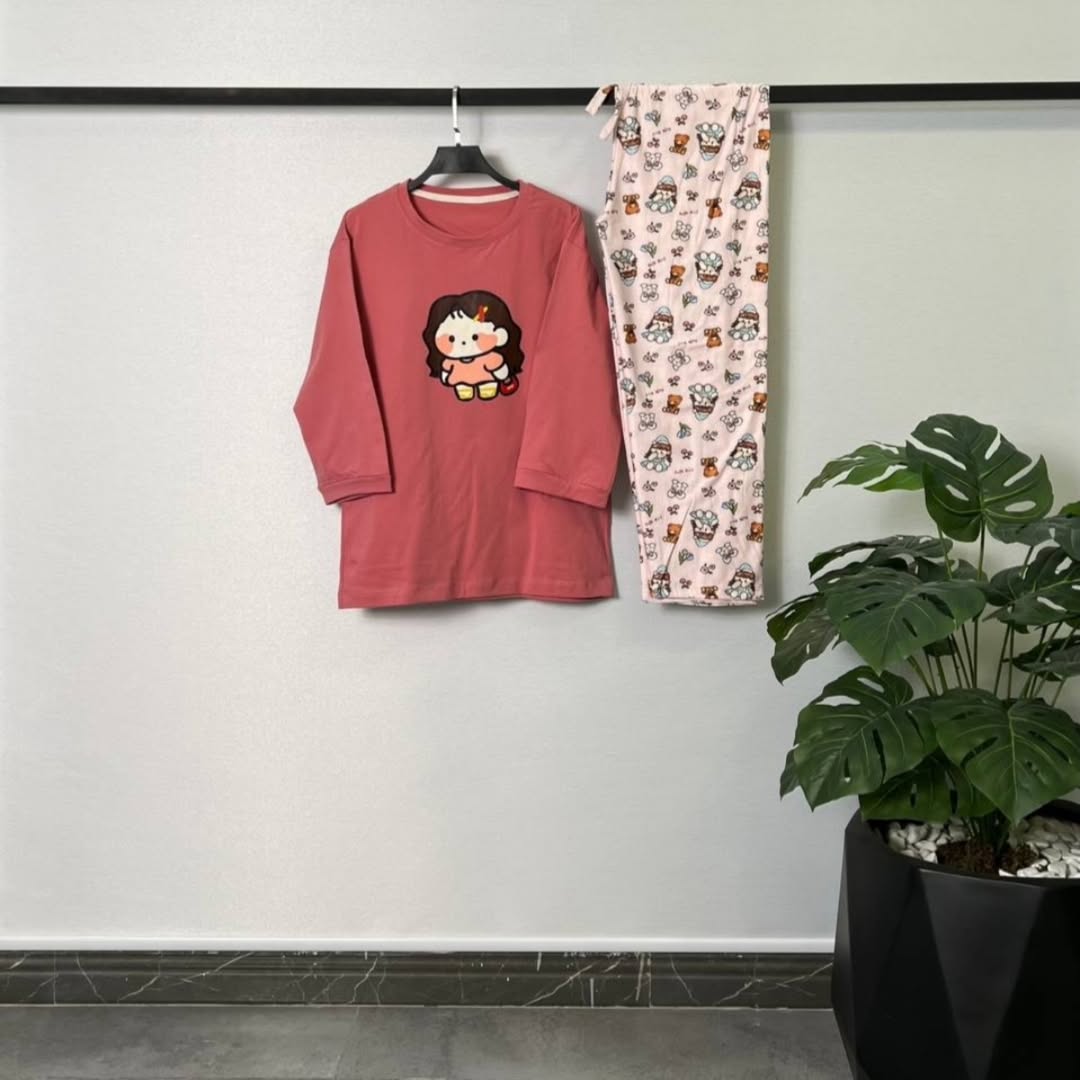 ست شامل تیشرت آستین سه ربع و شلوار با جنس ۱۰۰٪ نخ پنبه و پنبه اسپان. تیشرت دارای قد ۷۰ و دور سینه ۱۰۴/با کشسانی ۱۱۴. شلوار با قد ۹۶ و دور کمر ۶۰/با کشسانی ۹۰.